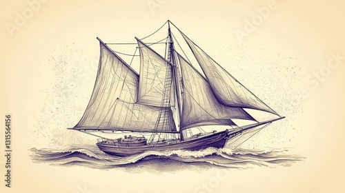 Vintage Sailboat Illustration, Maritime Vessel on Textured Seascape