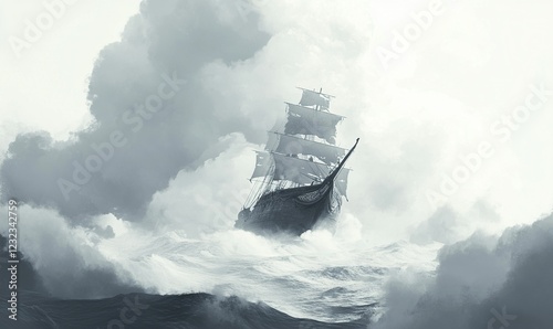 Vintage sailing ship battling stormy ocean waves under dramatic cloudy sky