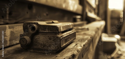 Vintage scotch tape dispenser, old warehouse, sepia tones, photograph, nostalgic