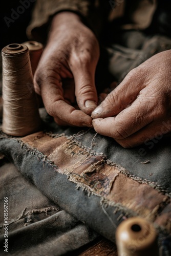 Vintage sewing techniques and hands repairing patchwork fabric in rustic setting,National Sewing Month
