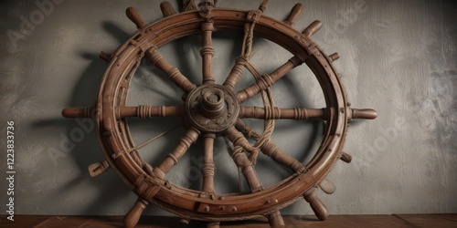 Vintage ship wheel with rope in worn leather seat , monochrome, distressed, nautical