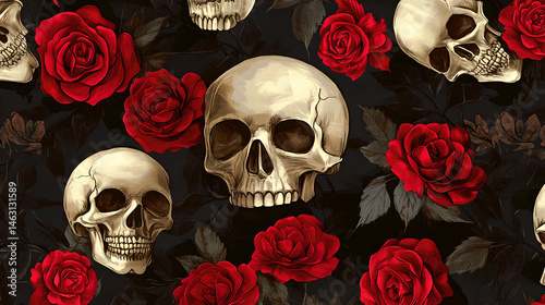 Vintage Skull and Red Roses Pattern on Dark Background – Gothic Floral Art
