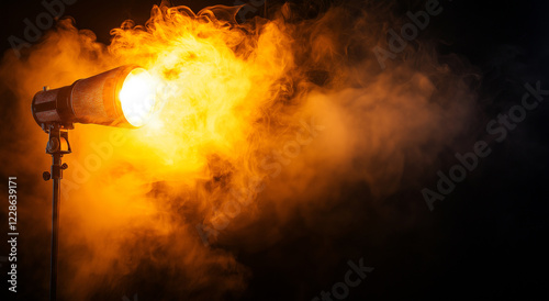 Vintage spotlight emits warm light through smoke, creating dramatic atmosphere. interplay of light and shadow enhances visual impact, perfect for artistic projects