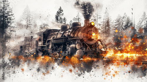 Vintage Steam Locomotive Glowing With Golden Particles In Winter Wonderland, Watercolor Illustration