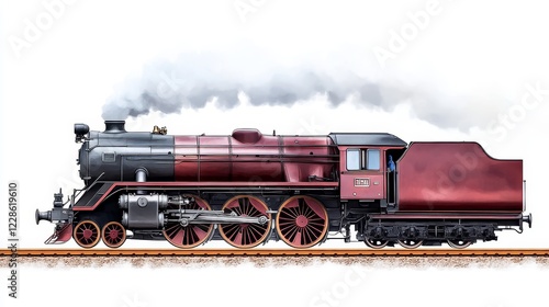 Vintage steam locomotive in motion, showcasing intricate design and vibrant colors against a white backdrop