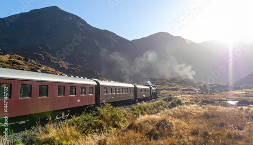 vintage steam train travels through picturesque landscape, surrounded by mountains and lush greenery. sunlight casts warm glow, enhancing serene atmosphere of this scenic journey