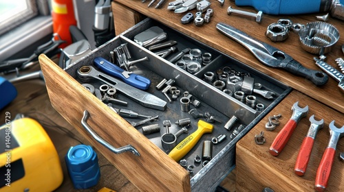 Vintage storage drawer filled with tools workshop environment detailed close-up organized and functional