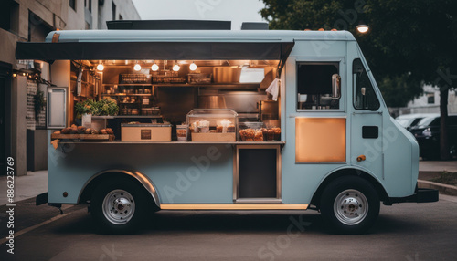 Vintage street food truck parked in the city.