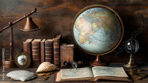 Vintage Study Desk with Globe, Books, and Nautical Decor
