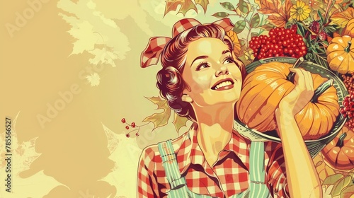 Vintage style illustration of a smiling woman with autumn leaves in the background