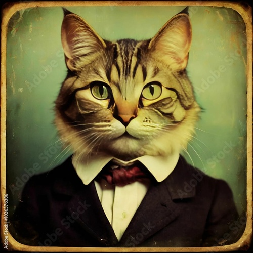 vintage style photo of a cat wearing a suit white shirt and bowtie