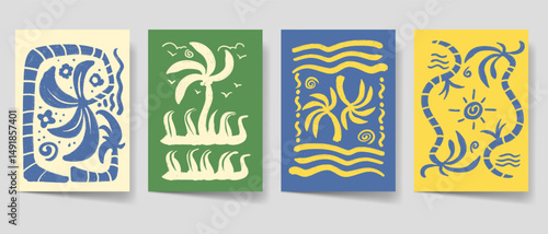 Vintage summer poster set, Flyer bohemian style for print. Beach poster template bundle. Mid century graphic collection