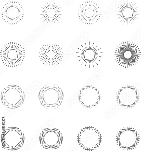 Vintage sunburst. Bursting rays sunrise firework starburst blast burst sunset star hand drawn collection. Radial sunset beams light ray radiant spark. Retro radiant sunburst. Trendy Vector badge set.