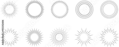 Vintage sunburst. Bursting rays sunrise firework starburst blast burst sunset star hand drawn collection. Radial sunset beams light ray radiant spark. Retro radiant sunburst. Trendy Vector badge set.