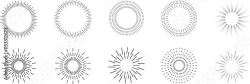 Vintage sunburst. Bursting rays sunrise firework starburst blast burst sunset star hand drawn collection. Radial sunset beams light ray radiant spark. Retro radiant sunburst. Trendy Vector badge set.