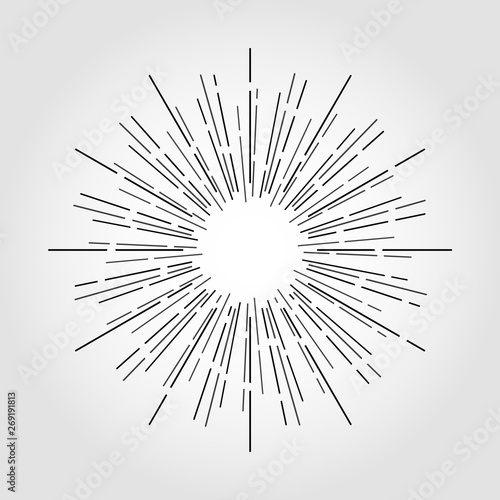 Vintage sunburst in lines shape, linear radial burst. Retro sun for hipster culture. Vector