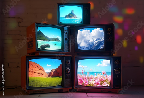 Vintage televisions display stunning landscapes, including mountains, beaches, and flowers, creating nostalgic and colorful atmosphere