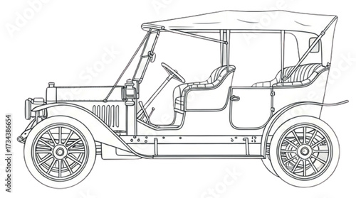 Vintage Touring Car Line Art Vector | Early 20th Century Open-Top Automobile Blueprint Style, Side Profile, Spoked Wheels, Flat Clean Lines, Technical Illustration