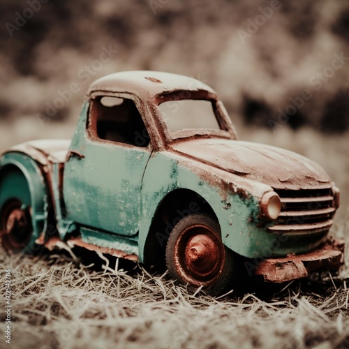 Vintage toy car on the ground in the park. Selective focus.