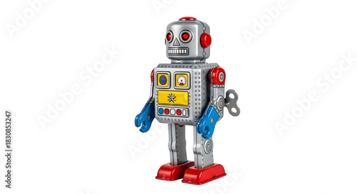 Vintage toy robot with wind up key silver and red isolated on transparent background