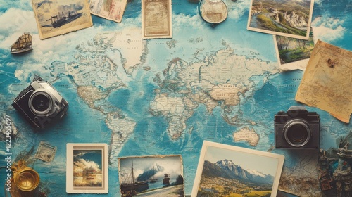 Vintage travel map with cameras and postcards on wooden table