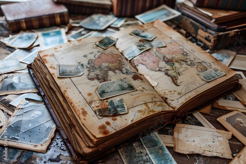 Vintage Travel Memories: An Old Map Book Surrounded by Historical Photographs