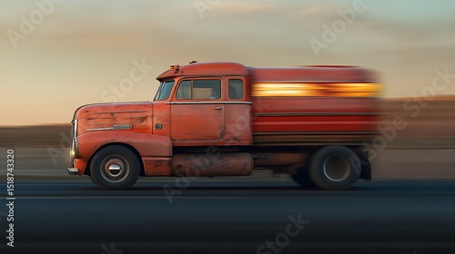 Vintage Truck in Motion: A Classic American Truck Speeds Across the Desert Landscape at Sunset