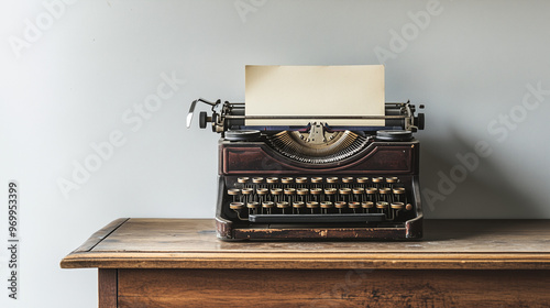 Vintage typewriter with blank paper on a wooden desk against a neutral background, evoking a nostalgic and timeless ambiance.