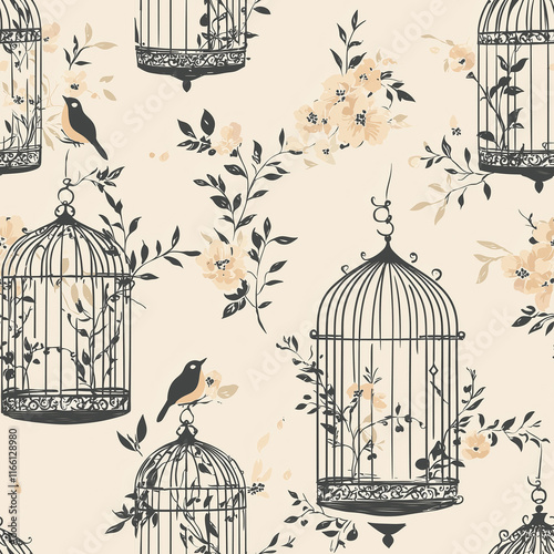 Vintage Vintage pattern featuring birdcages, delicate flowers, and birds on a soft background, ideal for decorative or textile design.