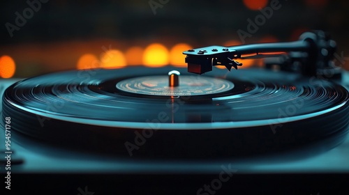Vintage vinyl record spinning on a turntable. Soft ambient light adds to the nostalgic feeling, allowing the essence of classical music appreciation to be captured.
