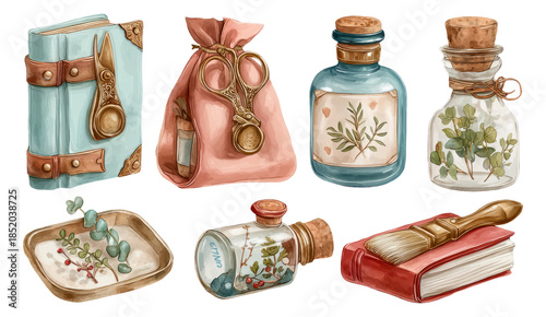 Vintage Watercolor Botanists Foraging Instruments and Supplies Hand-Drawn Collection