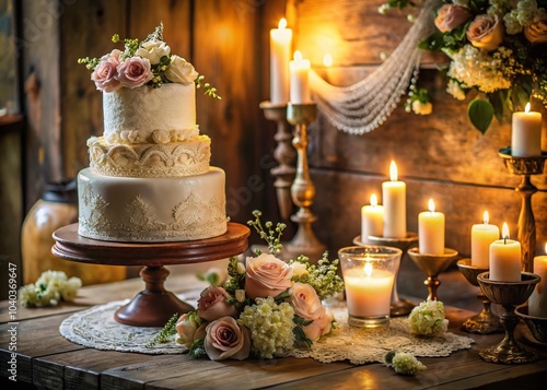 Vintage Wedding Cake Display in Rustic Setting with Floral Accents and Soft Lighting for Elegant Celebrations