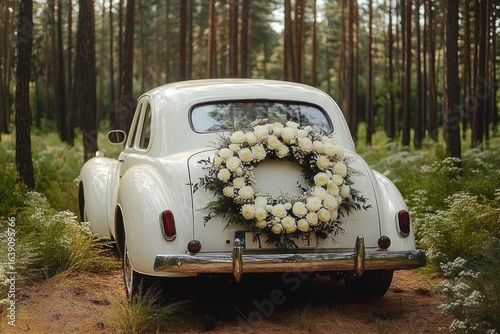 Vintage white car decorated with a large white rose floral wreath on the back, parked on a forest path surrounded by tall pine trees and greenery
