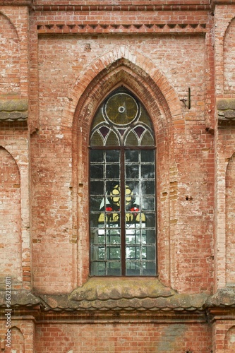 Vintage window. Old red brick church