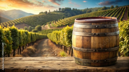 Vintage wine barrel aged in oak wood against a rustic stone vineyard backdrop, aging, wine cellar, aging, wine cellar, grapes