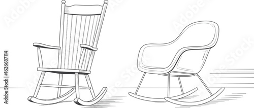 Vintage wooden rocking chair, modern plastic rocking chair, furniture CAD drawing, flat vector illustration, home decor, seating design, comparison