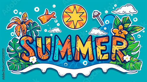 Vintage word Summer illustration with vacation attributes, water, sand and palms