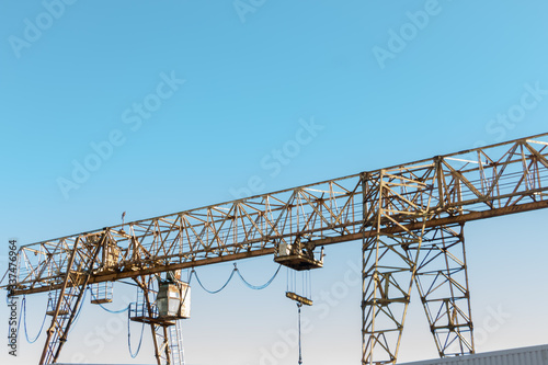 Vintage working gantry crane rusty yellow, bottom view, close-up against a blue spring sky