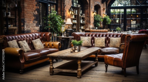 Vintage-inspired cafe interior, eclectic furniture, exposed brick walls, ambient lighting, capturing the charm and character of boutique design, Photo