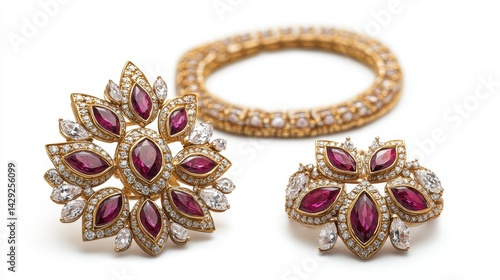 Vintage-style gold jewelry set with marquise diamonds and radiant rubies on earrings, necklace, and matching ring, isolate on white background