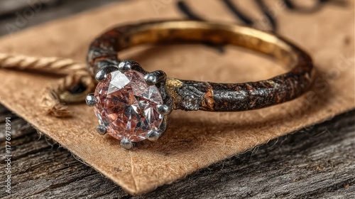 Vintage-style handcrafted ring with a pink gemstone, brown and silver, representing rustic jewelry or an engagement