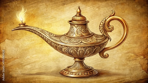 Vintage-style illustration of an old-fashioned oil lamp with ornate metalwork and curved handle, surrounded by elegant linework and subtle texture.