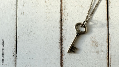 Vintage-style key pendant with rounded top and worn metallic surface hangs from delicate silver chain on rustic white-painted wooden background with visible grain and brown discoloration,
