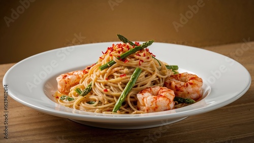 Vintage-style spaghetti featuring prawns, asparagus, and hot chili flakes