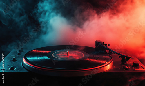 Vinyl record player with colorful smoke background creating a nostalgic atmosphere.