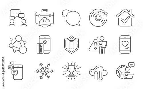 Vinyl record, Trophy and People chatting line icons set. Construction toolbox, Love chat and Integrity signs. Messenger, Smartphone protection and Air conditioning symbols. Line icons set. Vector