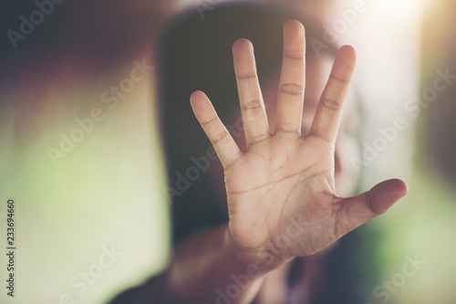 Violence, Abuse, Punishment, Woman raised her hand for dissuade, campaign stop violence against Woman, black and white color.