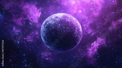 Violet planet with a solid surface and craters in space featuring a beautiful cosmic background and a view from space in a 3D cartoon rendering