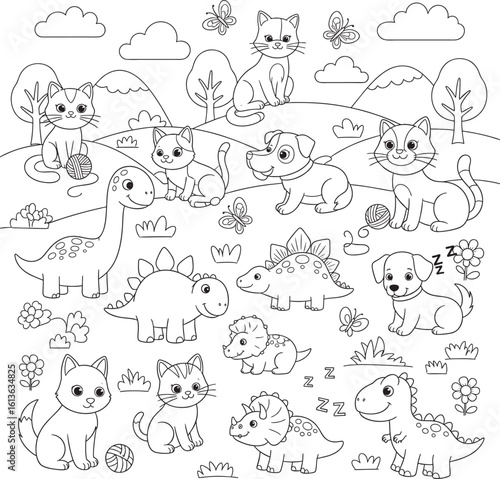 viral Cute dogs cats Dinosaur animals Landscape Printable Coloring Page for Kids Vector Art editable design for t-shirt and multipurpose use in high definition format