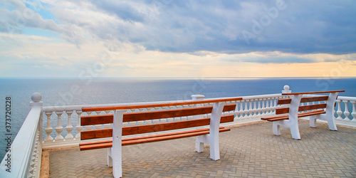 Virgin nature. Summer view. Ocean scenery. Viewing platform with bench. Empty promenade. Stormy dark sky. Calming sea